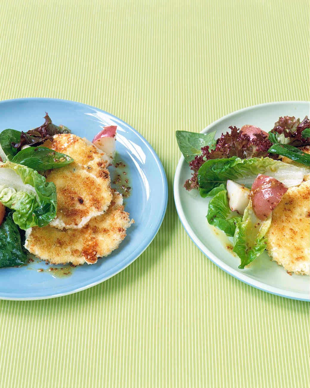 5. Toss the greens and potatoes in the dressing. Divide the salad among 4 plate, and top each with 2 cheese disks.